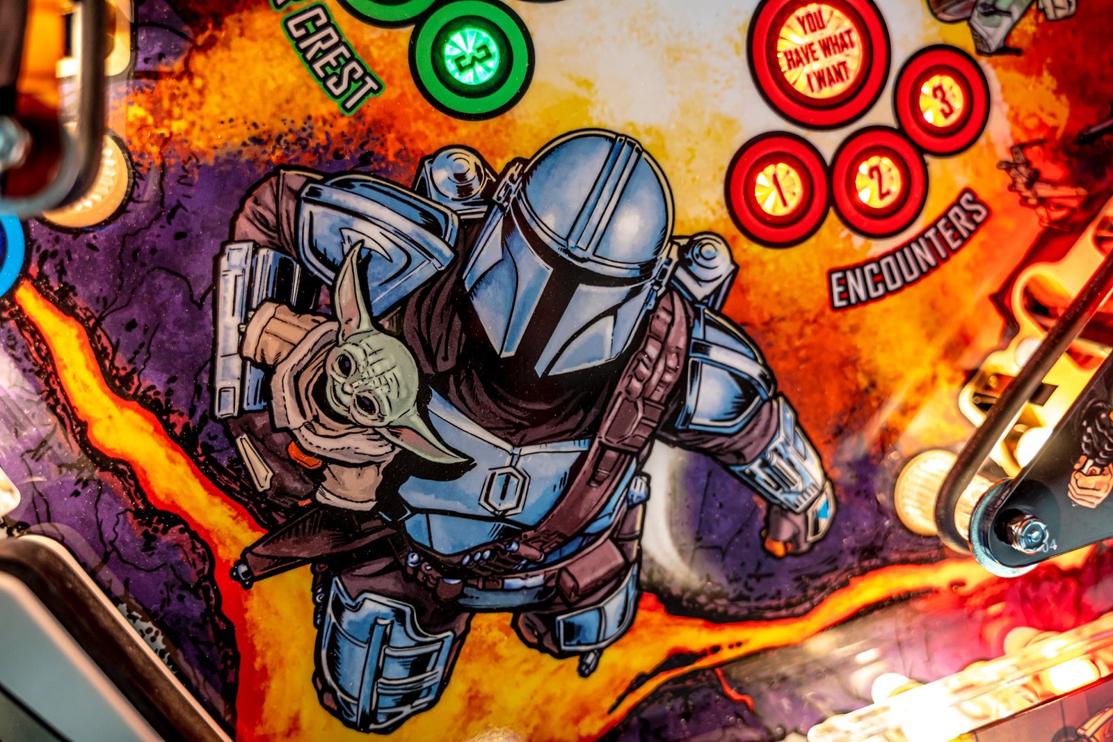 The Mandalorian Pro Pinball Machine features stunning artwork that captures the essence of the beloved Disney+ series. The cabinet is adorned with vibrant, detailed illustrations of iconic characters, including the Mandalorian, Grogu (The Child), and other familiar faces. The playfield is intricately designed with thematic elements and intricate details, immersing players in the rich, action-packed world of “The Mandalorian.”