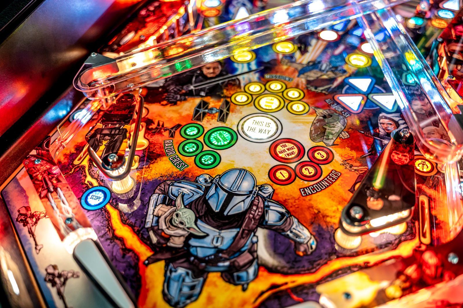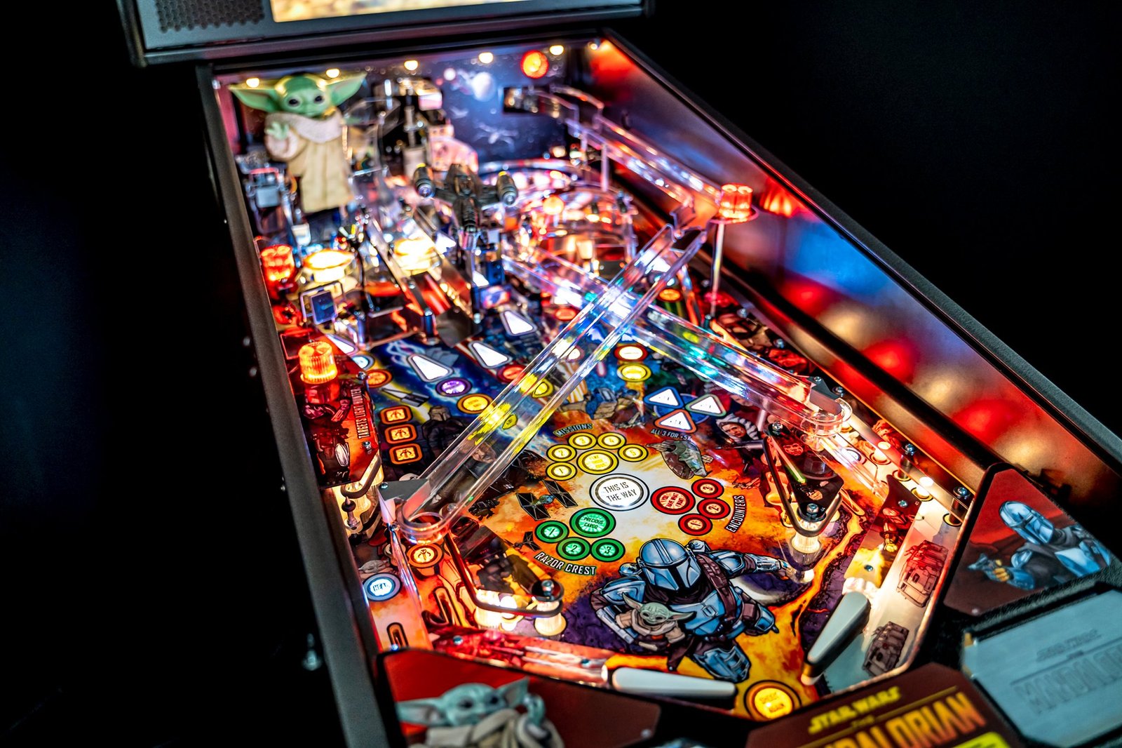 - Interactive Toys and Mechanisms: The Mandalorian Pro Pinball includes a variety of interactive toys and mechanisms that bring the adventure to life. Key features include a custom-molded Razor Crest ship, a rotating target, and interactive ramps, all adding depth and excitement to the gameplay.